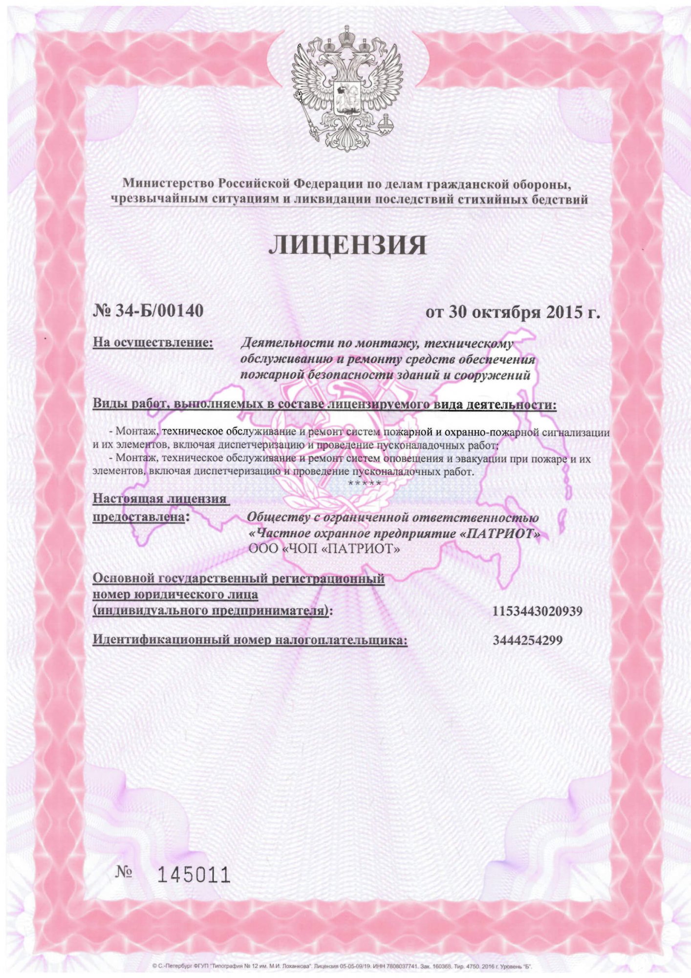 Лицензия на осуществление монтажу и техническому обслуживанию (ЧОП Патриот)
