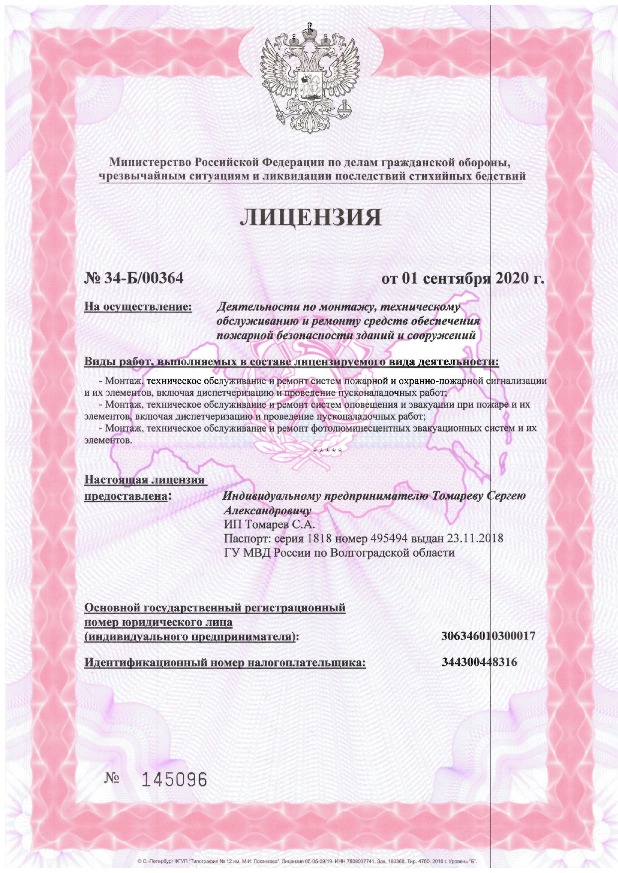 Лицензия на монтаж средств пожарной безопасности ИП Томарев С.А.